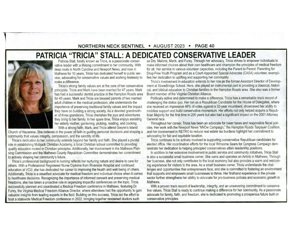 Tricia Stall announces for Mathews County Board of Supervisors