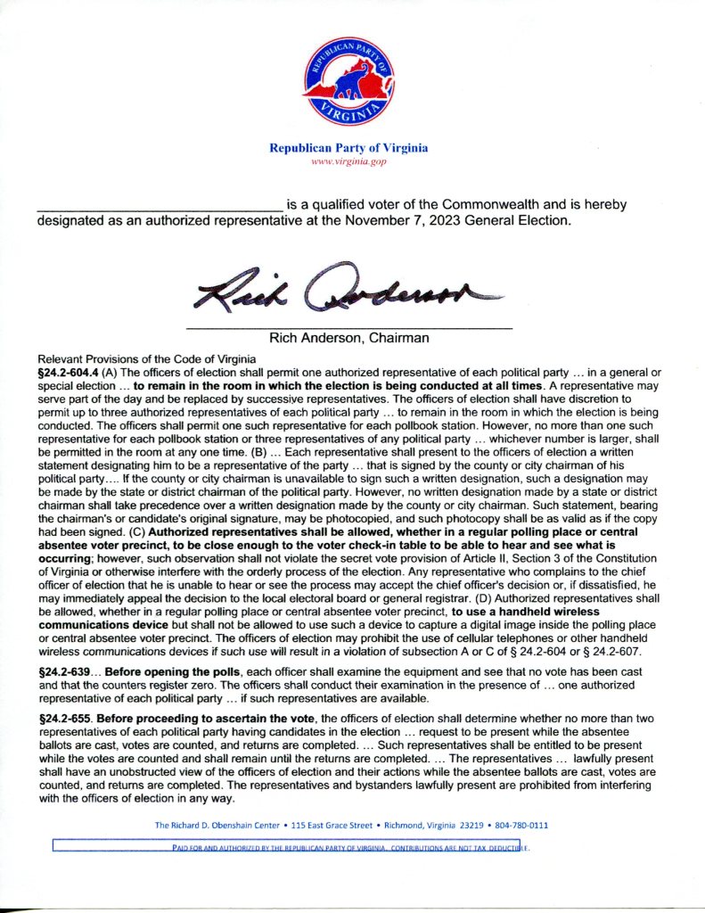 2. Recall that Poll Watchers must be authorized. I’ve attached a completed authorization signed by Chairman Anderson. If you prefer to make a separate authorization form for yourself to sign for your city or county, I’ve attached a template.