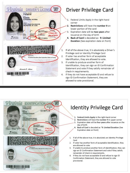 (posted 9/25/23) These privilege cards are almost identical to a Virginia driver’s license, election officials might mistakenly accept them as a valid ID that can be used to vote. Be aware & share!