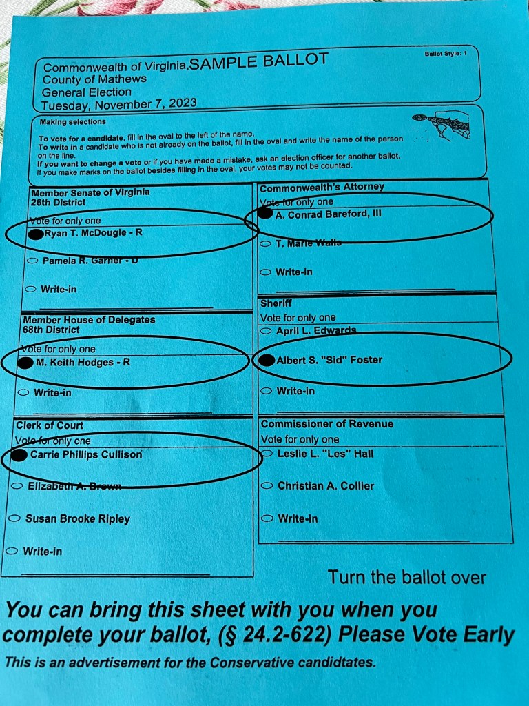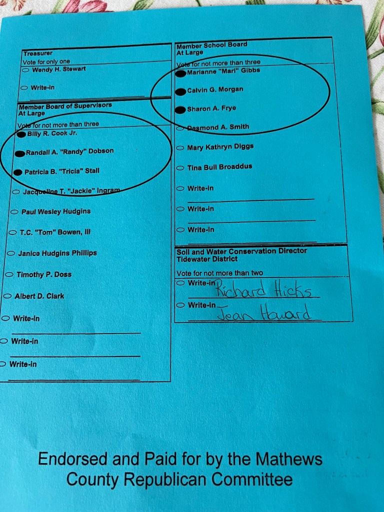 - Pick up an Absentee Ballot application at the Mathews Voter Registration and Elections Office 10604 Buckley Hall Road, Mathews 23109
